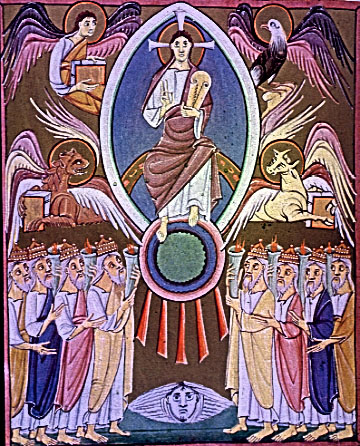 | Adoration of the Elders. folio 11v-Apoc. 4:9-11. 1000 Bamberg Apocalypse. Ms. 140 (AII 42) Staatliche Bibliothek, Bamberg |