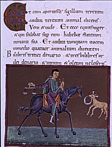 | Third Rider. folio 15r-Apoc. 6:5-6. 1000 Bamberg Apocalypse. Ms. 140 (AII 42) Staatliche Bibliothek, Bamberg |