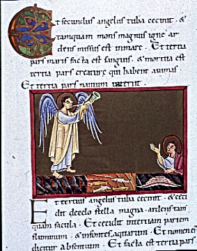| First Trumpet Blast. folio 20r-Apoc. 8:17. 1000 Bamberg Apocalypse. Ms. 140 (AII 42) Staatliche Bibliothek, Bamberg |