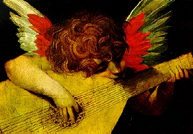 I take you back--humor me: it's a Felliniesque, sentimental journey-- to Sister Carmelita’s second-grade classroom, St. Columba’s school, Ottawa, Illinois, the year 1940. The assignment: to color a familiar picture of a guardian angel guiding a young child safely along a precarious cliff-edge path. It was my first introduction to real work--work in the most satisfying sense of the word: it was hard, it was intense, it was focussed, and it was fun! It gave me pleasure! Problem: scarlet-fever had kept me from nearly a third of the first grade, including the time when I would have been taught the acceptable, conventional iconography of angels, limiting the range of allowable colors to white and pink and perhaps, as a concession, a little light blue, but, you know, not too much. In invincible ignorance of these rules, I set myself the task of using every crayon in my box and, for the angel, to give it wings as beautiful as the most beautiful bird in my experience possessed: which just happened to be the redwing blackbird that flourished in the sloughs and backwaters of the Fox and Illinois rivers, my childhood haunts. Almost finished, and proud of my work, I still had six unused crayons. So I added a not very realistic rainbow in the background. Yet more heterodoxy was there: I was doing all this, scandal of scandals but by then irremediable, with my left hand. Sister Carmelita’s critique was devastating; it quenched the fires of my artistic pride and brought me to the edge of tears. But at that moment, the principal, Sister Andrea, was passing in the hall and from the doorway witnessed the scene.