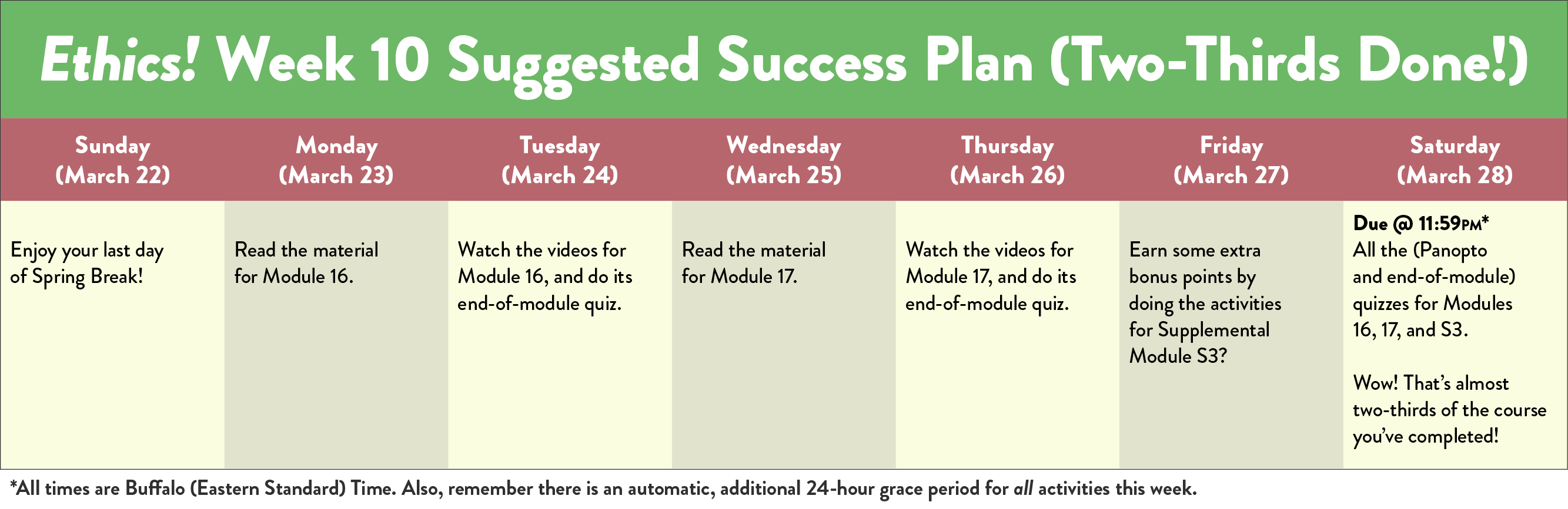 An organized table listing out all the important dates for this course, along with links to each of the course modules.