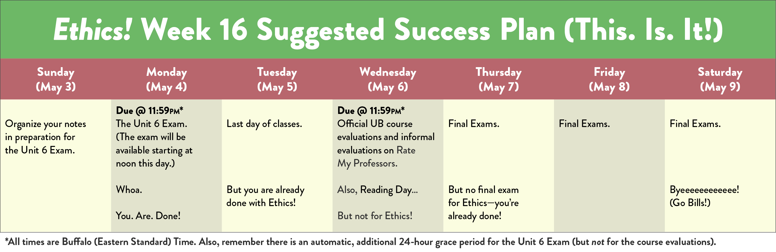 During the semester, I’ll be sending you weekly emails and also posting them on UB Learns.